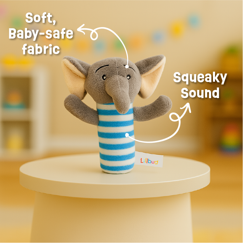 Plush elephant-shaped toy along with squeaky sound for early auditory stimulation and gentle grasping practice.