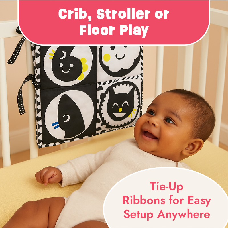The Black and White Cloth Book is perfect for newborns, with bold patterns, crinkle sounds, and a squeaker to boost sensory and visual development.