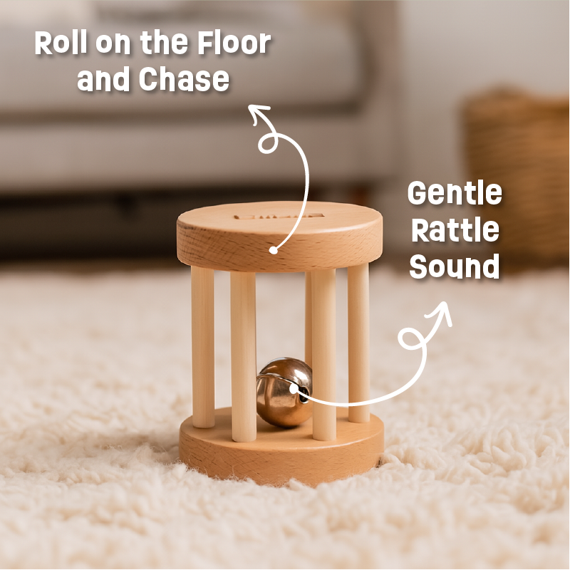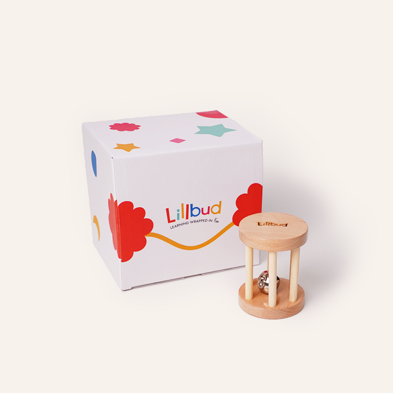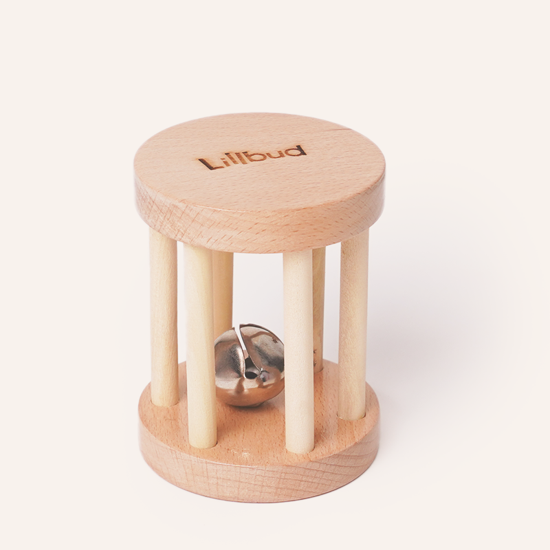 The Cage Rattle features an open, easy-to-grasp design made just for tiny hands. Its lightweight structure and enclosed ball invite babies to shake, turn, and explore freely.