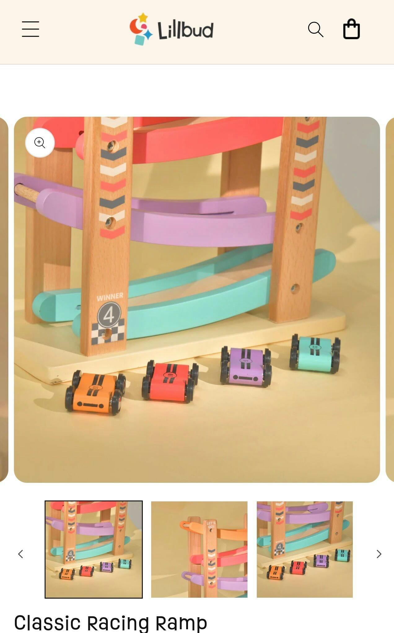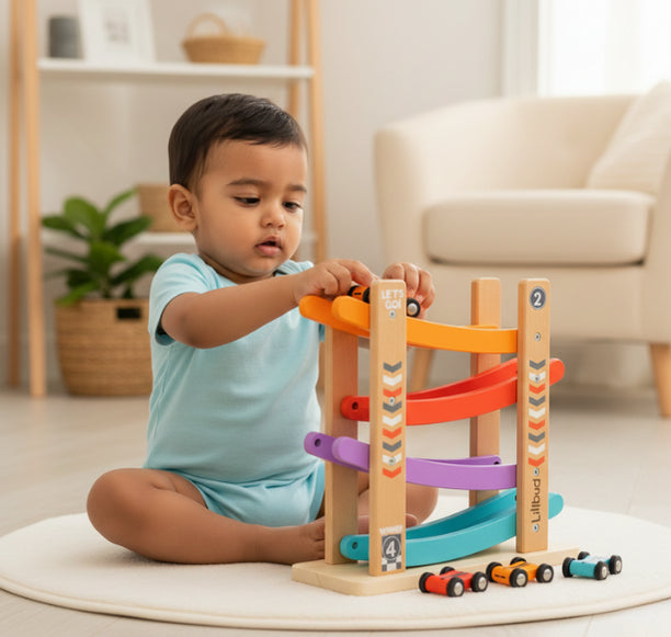 LiLLBUD's Classic Racing Ramp Toy brings non-stop excitement to playtime with its four-level track and brightly colored cars.