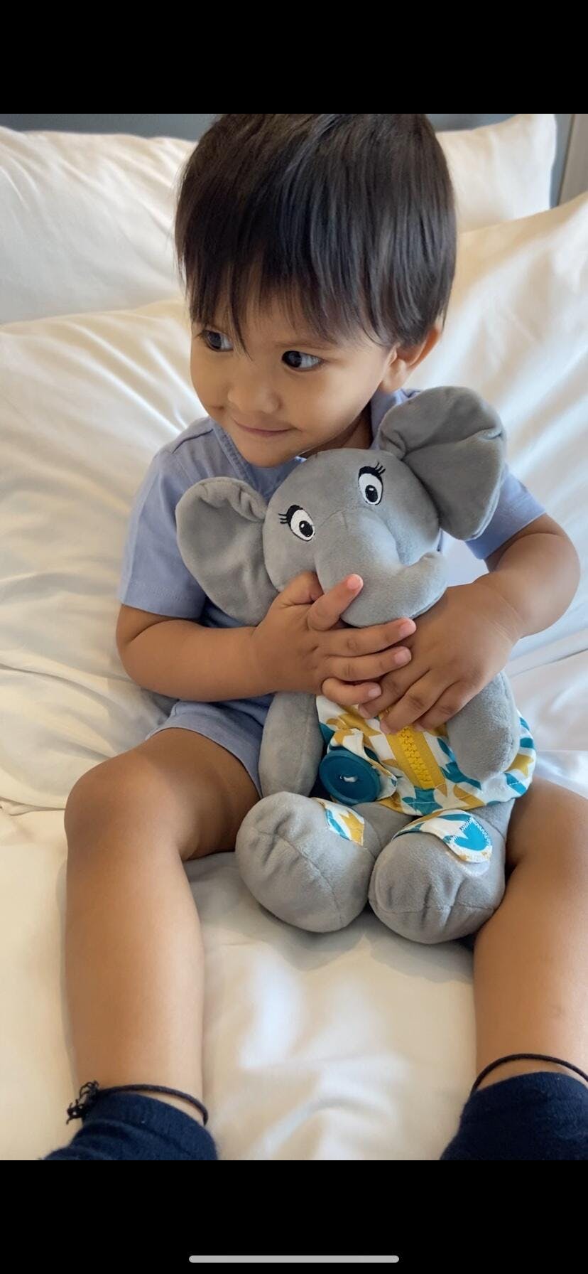 A premium plush elephant for kids with zip, button, and velcro tasks to learn dressing skills.