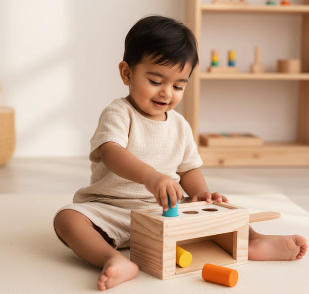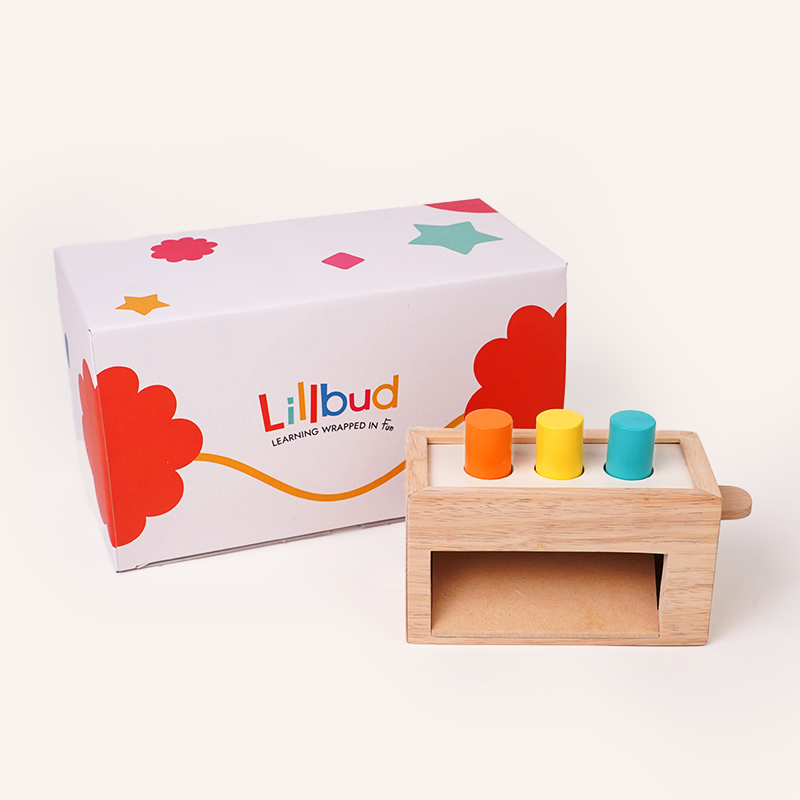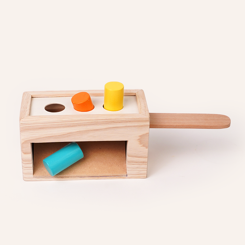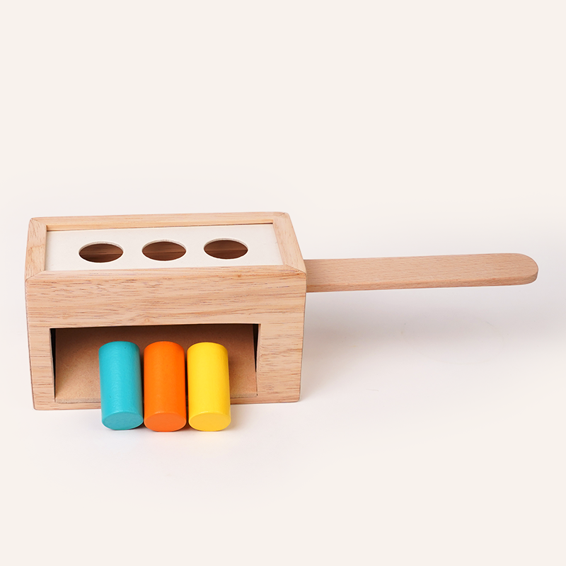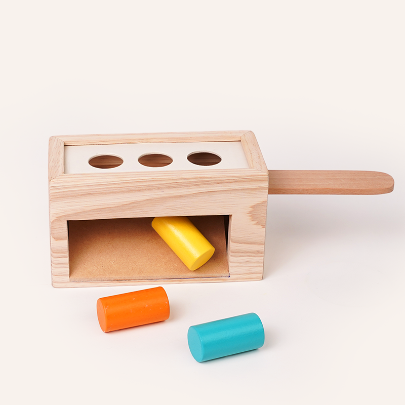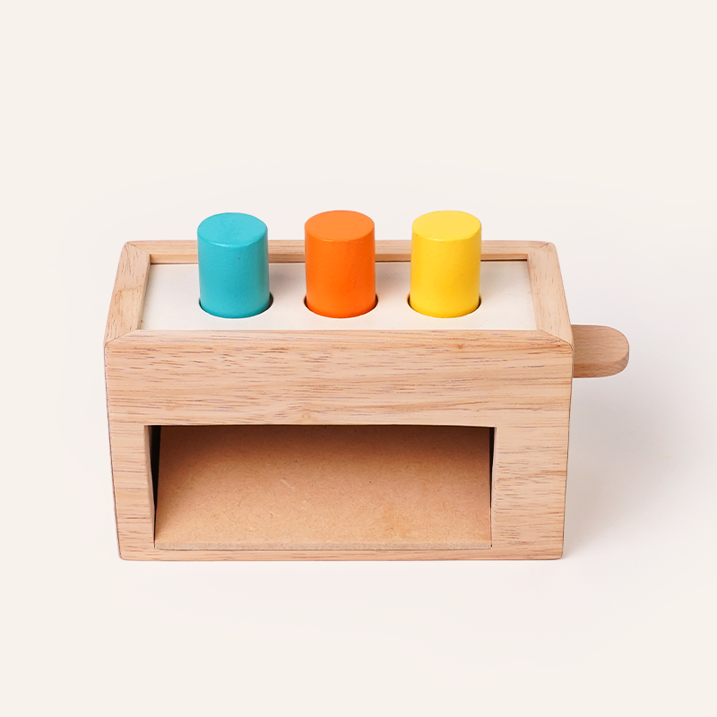 A wooden box with colorful pegs that pop down and roll out to surprise your baby.