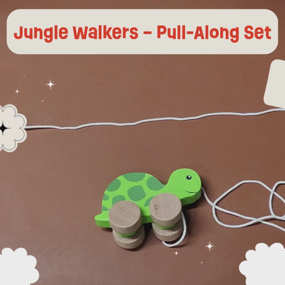 The Jungle Walkers Pull-Along Set features a cheerful turtle and hippo on smooth wheels, encouraging toddlers to walk, explore, and play imaginatively.