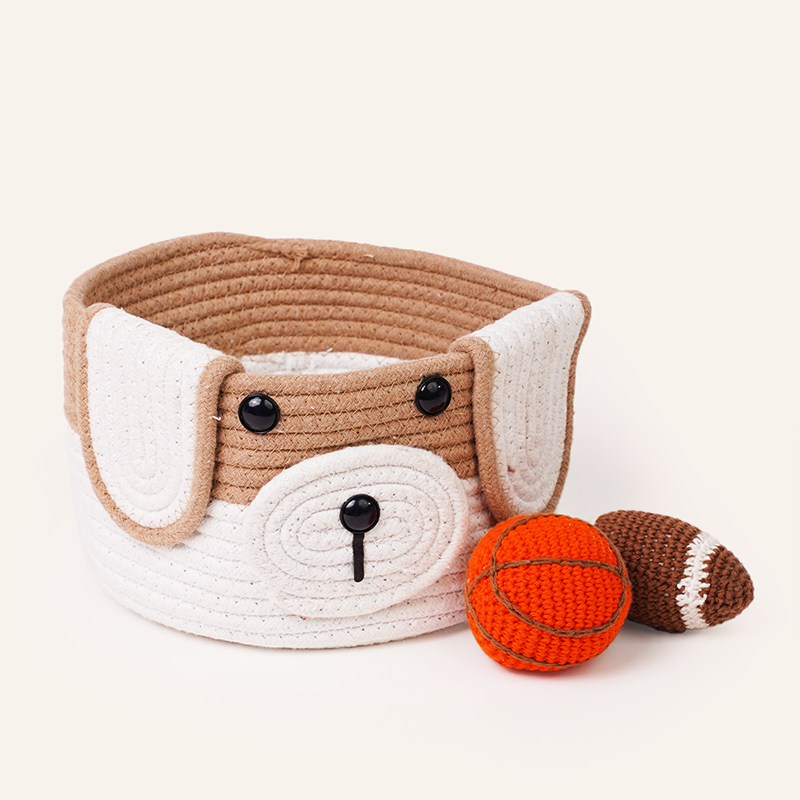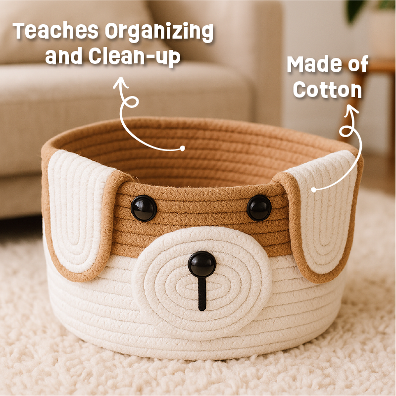 Soft animal-face basket that encourages clean-up habits, early responsibility, and motor coordination.