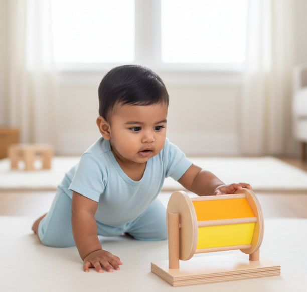 The Rainbow Drum rolls gently with every push, inviting babies to crawl, reach, and explore through sound, color, and movement.