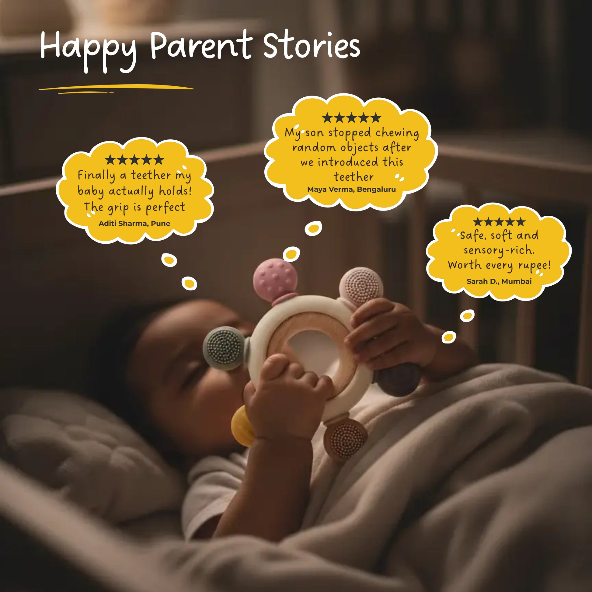 Easy to grasp and safe to chew, it promotes hand-mouth coordination, fine motor control, and self-soothing during teething phases.
