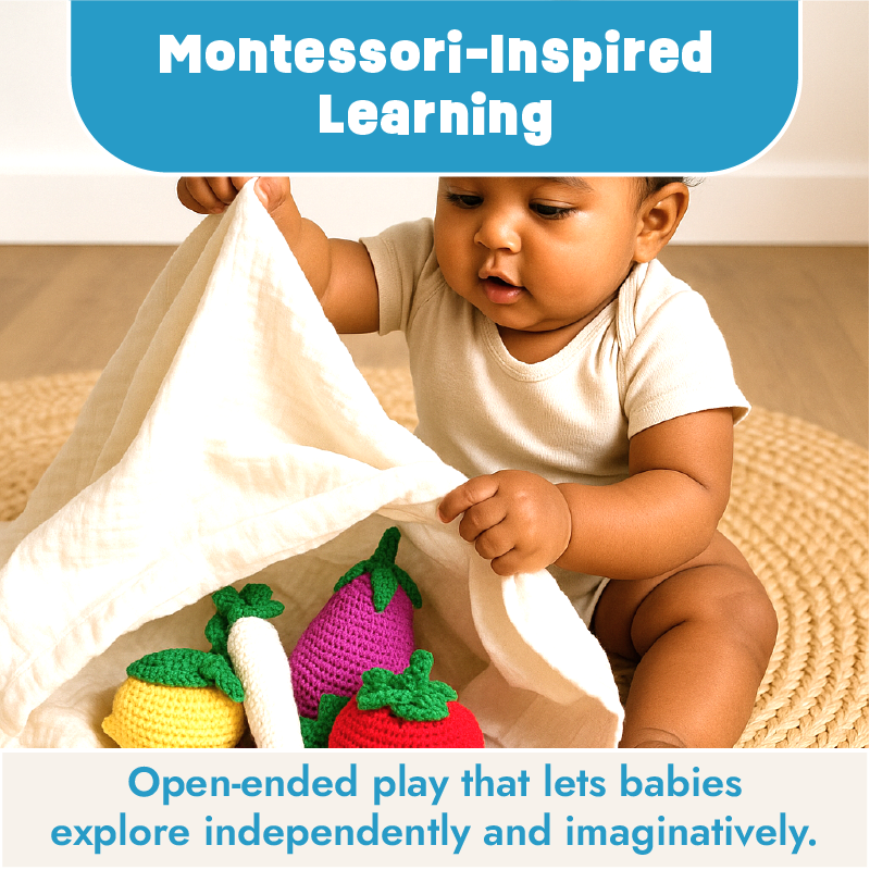 Handcrafted crochet play veggies to explore texture and pretend munching - great for sensory and early pretend play.