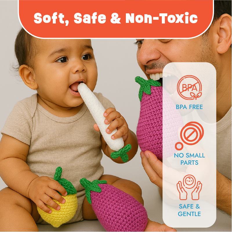Crafted with love by Lillbud, the Veggie Munch Set features soft, plush vegetables that babies can grab, squish, and pretend to nibble—perfect for sensory and language development.
